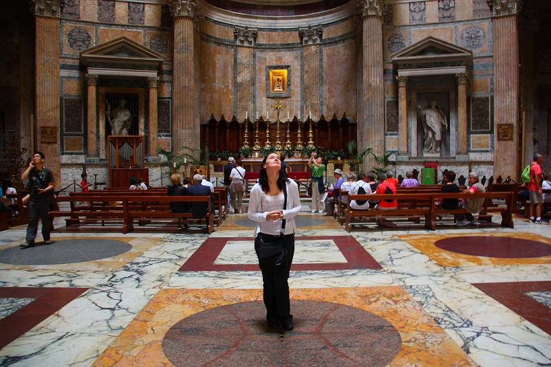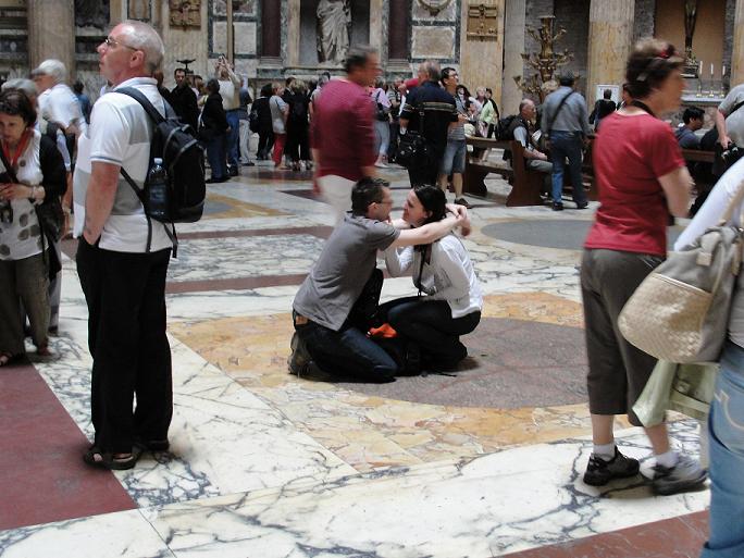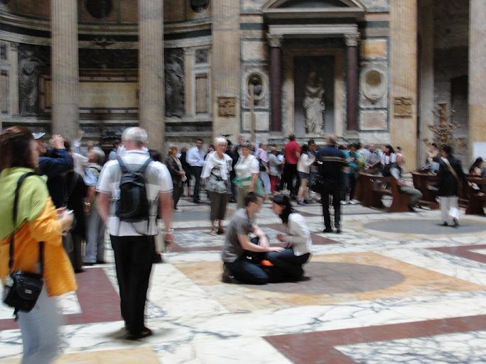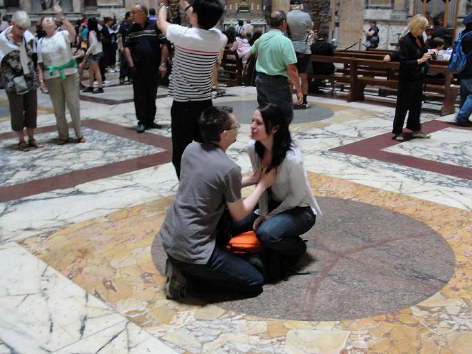 “In September 2010, my partner Tom and I finally took the trip to Italy that we’d been talking about for the better part of our seven years together but never actually gotten around to, for one reason or another. We finally threw caution to the wind and set off to see Venice (before it sinks, apparently). We started off in Rome and were blown away by the wealth of history that is everywhere you turn. On the third day of our trip, we went to see the Pantheon. We wandered around, staring up at the awe-inspiring dome. Tom said that he would like to take a photo of me standing underneath the oculus. We located the middle of the floor and he dropped down to get the camera out of the backpack. Once he had the camera ready, he said “I want you to look up”. So I looked up. And looked up… and looked up, thinking to myself “How long am I supposed to keep doing this?”. When I looked down, Tom said “… and I want you to marry me”. My mind just stopped. I had nothing!! I just stood there mumbling “ohmygod” over and over. After what felt like an eternity, for both of us, my brain caught up and helpfully prompted “You have to say something! This is getting awkward!”. So I crouched down too and said “Of course I’ll marry you”. We kissed… and got told off by a French tour guide for inappropriate behaviour in a church.”